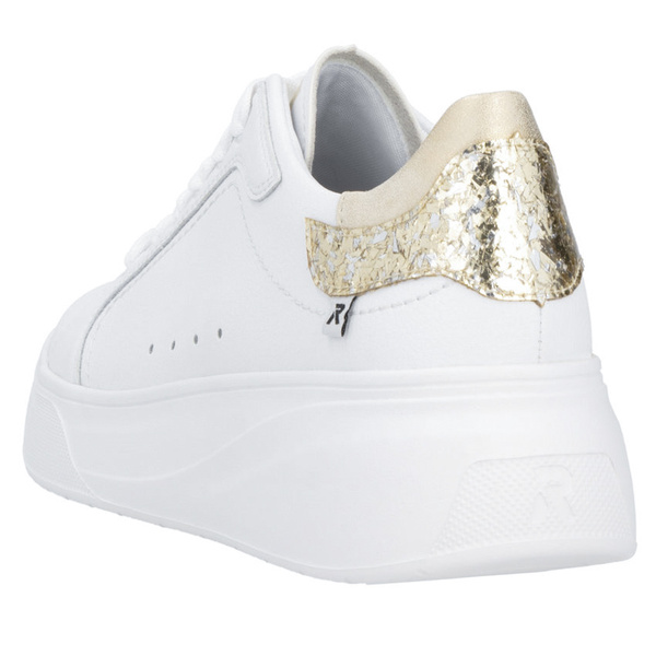 Te białe sneakersy damskie to połączenie wygody i modnego designu. Dzięki naturalnej skórze są przewiewne i trwałe, a gruba podeszwa zapewnia amortyzację i komfort na co dzień. Złote detale dodają im subtelnej elegancji, co sprawia, że sprawdzą się zarówno w casualowych, jak i bardziej stylowych stylizacjach. Niezwykle lekkie dzięki technologii Rieker Light, te buty sportowe na platformie to idealny wybór na wiosnę – lekkie, wygodne i ponadczasowe.