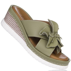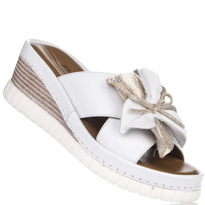 Klapki na koturnie damskie skórzane Artiker 54C0537 białe z kwiatkiem
