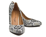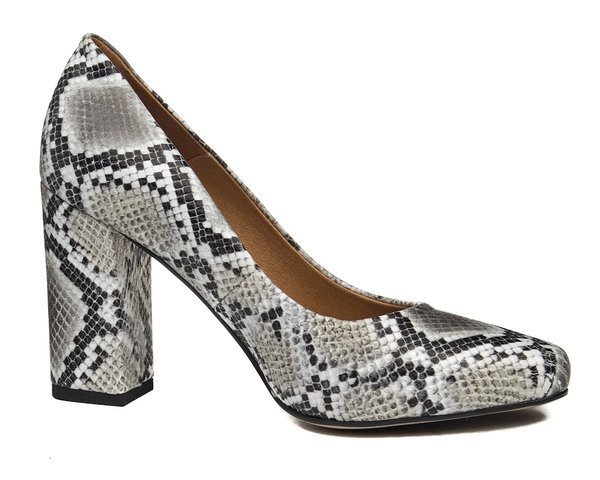 - Czółenka na słupku Prestige 2032 wykonane z naturalnej skóry w wężowym wzorze w białym i szarym odcieniu.