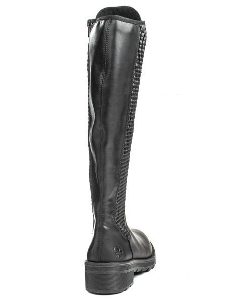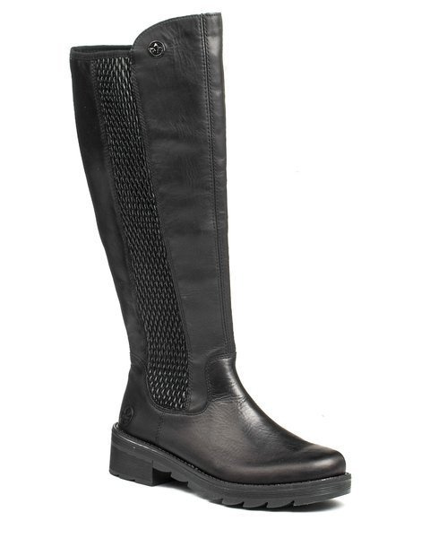 Kozaki damskie Rieker model X0554. Obuwie zimowe wykonane z naturalnej skóry i stretchu. Kozaki w czarnym kolorze. Ocieplone miłym futerkiem i materiałem. Wkładka to ciepły filc. W kozakach Rieker użyto technologii: