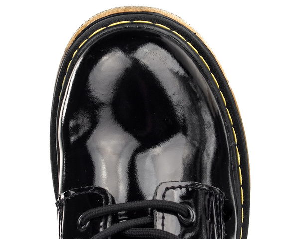 - Buty damskie posiadają cholewkę wykonaną z naturalnej skóry lakierowanej w czarnym kolorze