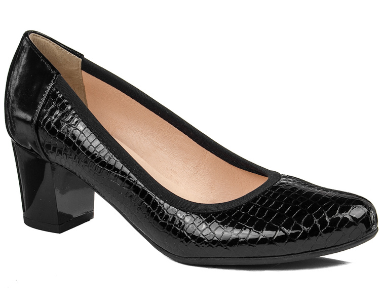 Czółenka Arka Bioeco model 5175 w kolorze czarnym. Obuwie wykonane ze skóry naturalnej lakierowanej. Obcas w kształcie słupka o wysokości 5,5 cm . Cholewka to najwyższej klasy skóra naturalna. Tył buta obszyty skóra lakierowaną. Obuwie Arka zostały skonstruowane tak by zapewniały najwyższą wygodę nawet podczas długiego użytkowania. Podeszwa jest giętka i idealnie współpracuje podczas spacerów, czy użytkowania w pracy.