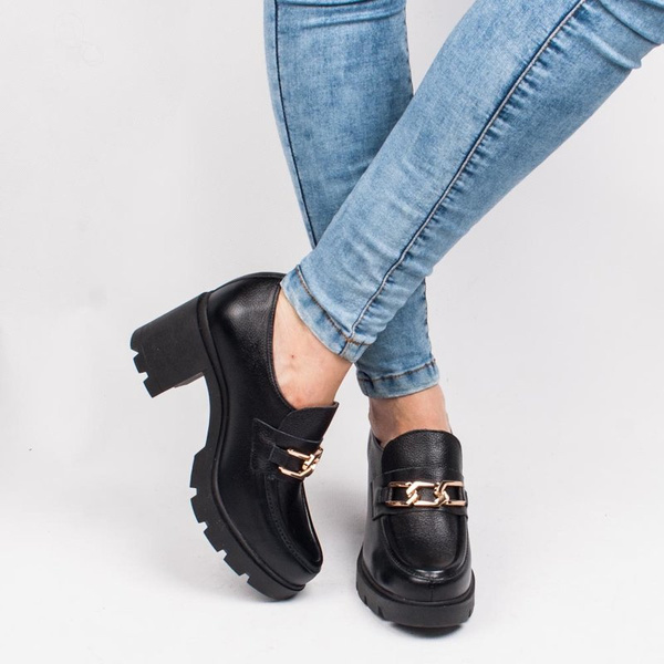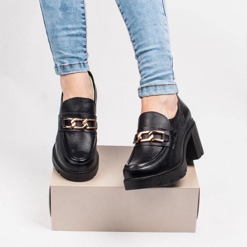 - Mokasyny na obcasie Lemar 20115 T.Czarny+zł wykonane z naturalnej skóry licowej ze złotą ozdobą