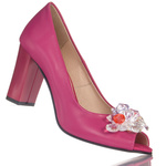 - Czółenka damskie z odkrytym noskiem z modną ozdobą w postaci kryształków, w różowym kolorze wykonane ze skóry naturalnej licowej