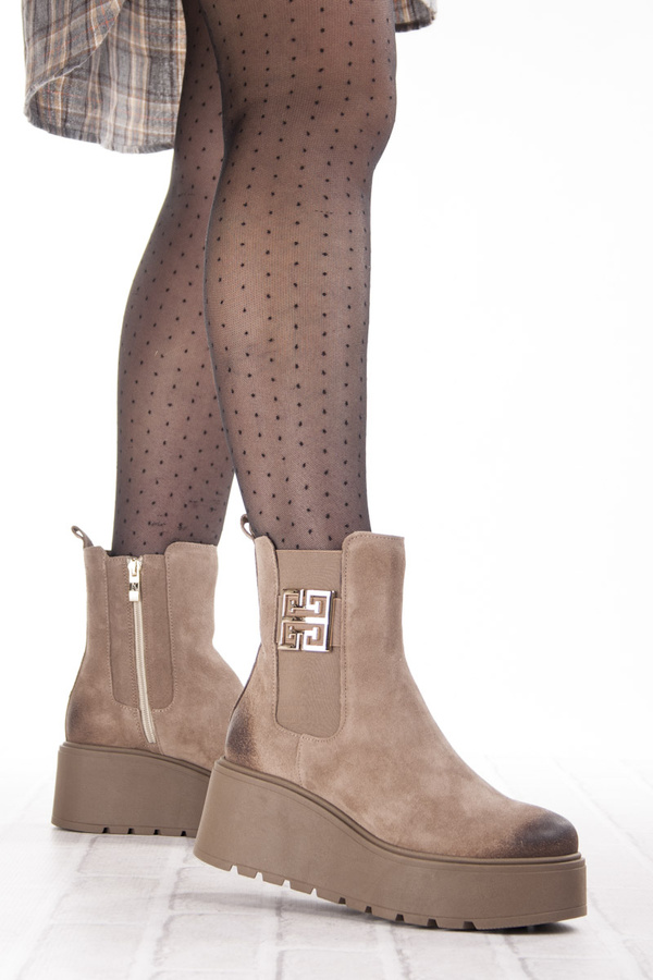 - Botki trzewiki na platformie Lemar 60390 W. Fango + złota ozdoba wykonane z naturalnej skóry zamszowej w beżowym kolorze