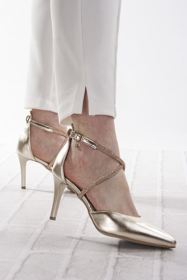 Szpilki z paskami Prestige 2227 złote skórzane z cekinami
