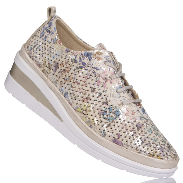 Stylowe i wygodne skórzane półbuty wiązane T. Sokolski AMI W26-150 FL BE to idealne obuwie na co dzień. Ich subtelny beżowy kolor z nadrukowanymi kwiatami nadaje im kobiecego i eleganckiego wyglądu. Dzięki miękkiej, skórzanej wkładce i porządnej gumowej podeszwie, zapewniają komfort przez cały dzień. Dodatkowo, obuwie damskie na koturnie delikatnie wysmukla sylwetkę i dodaje lekkości krokom.